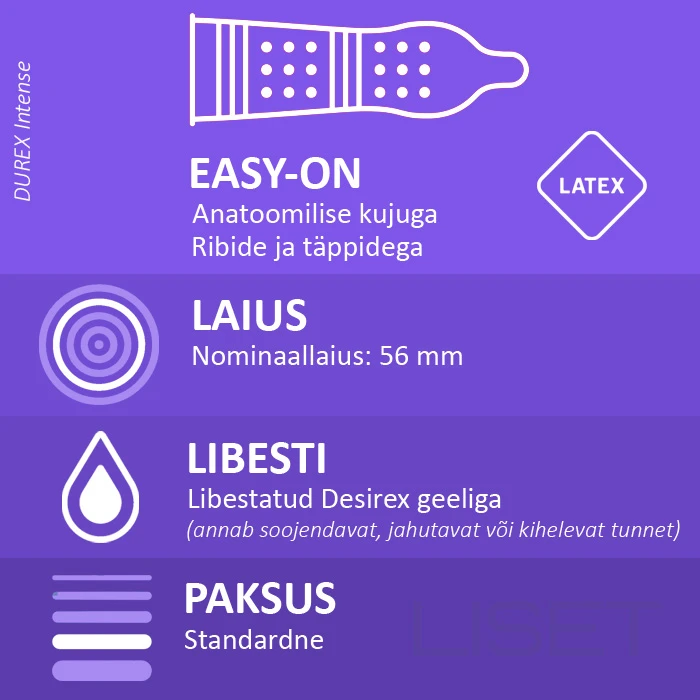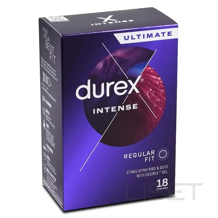 Durex Intense kondoomid sobivad suurepäraselt, kui sa soovid pakkuda naisele lisastimulatsiooni. Ribide ja täppidega tekstuur annab lisatundlikkust ja eellibestatud Desirex geel soojendavat, jahutavat või kihelevat tunnet, pakkudes naisele veelgi suuremat naudingut.