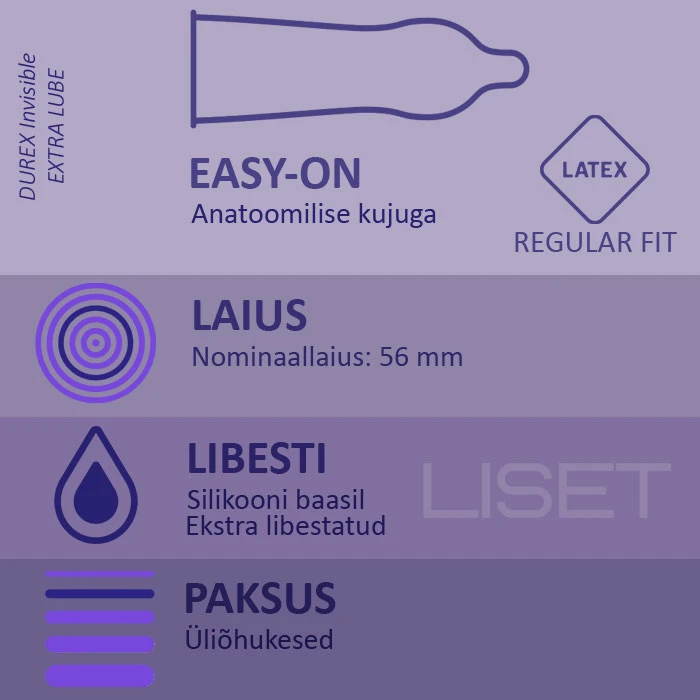DUREX Invisible ekstra libestiga kondoomid on loodud pakkuma maksimaalset tundlikkust, samal ajal pakkudes kõrgetasemelist turvalisust ja kaitset. Koos lisatud ekstra libestiga veelgi sujuvam tunne. - Loodud, et suurendada tundlikkust maksimumini, tagades samal ajal DUREXi kõrgetasemelise standardi - Ekstra õhukesed, võrreldes tavaliste DUREXi naturaalsest latekskummist kondoomidega - Lisatud libestit veelgi sujuvamaks kasutamiseks - Sirgeseinaline, nibukujulise otsaga, siledad ekstra silikoonlibestiga latekskondoomid - Nominaallaius: 56 mm - DUREX kvaliteet: 100% elektrooniliselt testitud, tehes igale partiile veel viis kvaliteedikatset; testitud ka dermatoloogiliselt. 8 kondoomi