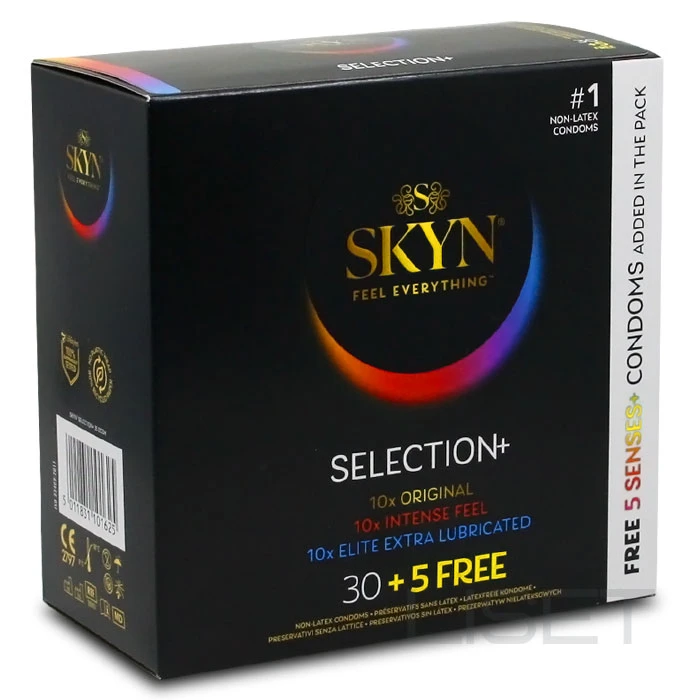 SKYN Selection 30 + 5 - mitmekesisus ja mugavus ühes pakendis! Avasta uusi aistinguid SKYN Selection 30 + 5 kondoomide komplektiga. Komplektis on 35 lateksivaba kondoomi, mis pakuvad mitmekesisust ja maksimaalset mugavust. Sobivad tundlikule nahale. Komplekt sisaldab: x10 SKYN Original x10 SKYN Extra Lubricated x11 SKYN Intense Feel x1 SKYN Elite x1 SKYN Passion Daiquri x1 SKYN Cherry Sunrise x1 SKYN Hot SKYN Selection 30 + 5 - kõik, mida vajad turvaliseks ja nauditavaks hetkeks!
