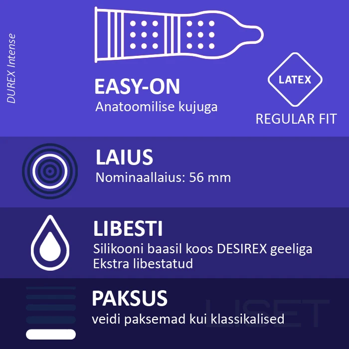 Naisele - stimuleerivate ribide ja täppidega tekstuur, kaetud Intense geeliga, et anda soojendav, jahutav või kihelev tunne, mis suurendab tundlikkust, andes erinevate tunnete lained, et kiirendada ja suurendada orgasmide sagedust ja intensiivsust. Veel intensiivsemaks sensuaalseks kogemuseks kasuta koos DUREX Intense geeliga.Mehele - annab suurema naudingu nähes naist nii erutatuna, tehes seksi mõlemale nii põnevaks. Kõik mehed saavad nüüd anda DUREX Intense kondoomiga vapustavaid orgasme! DUREX Intense kondoomid ei sobi anaalseksiks. Toote kasutamine võib põhjustada ärritust. Kui see juhtub, lõpetage kasutamine. Kui ärritus püsib, pöörduda arsti poole. Eriline viis, kuidas me oma kondoome teeme, tähendab, et need lõhnavad paremini. Stimuleerivate ribide ja täppidega tekstuur koos DESIREX geeliga soojendavaks, jahutavaks või kihelevaks tundeks. Easy-On kuju ja nibukujuline ots mugavuseks ja sobivuseks. Läbipaistvad ja libestusainega looduslikust latekskummist kondoomid. 100% elektrooniliselt testitud 20 kondoomi
