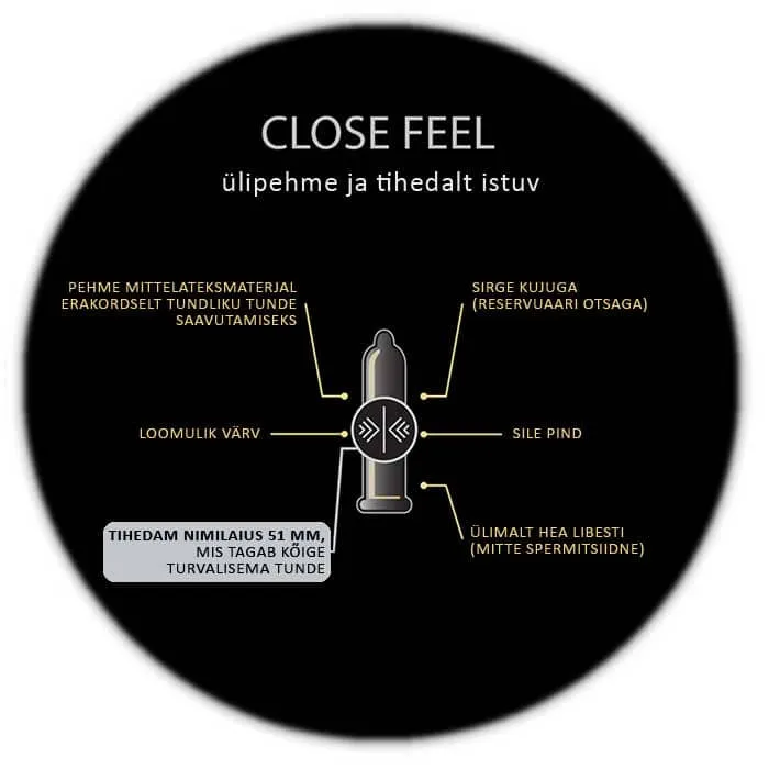 SKYN Close Feel ülipehmed ja tihedamalt istuvad kondoomid on loodud nii, et tunned justkui oleksid ilma kondoomita. Õhukesed kondoomid pakuvad suuremat tunnetust ja sensatsiooni. SKYN Close Feel sünteetilisest polüisopreenist valmistatud kondoomid on ideaalsed neile, kellel on lateksiallergia. Kondoomide õige kasutamine võib vähendada raseduse võimalust ja sugulisel teel levivate haiguste riski. SKYN kondoomid on valmistatud uusima SKYNFEEL-tehnoloogiaga, on sirgjoonelised ja lõhnaainega määritud.