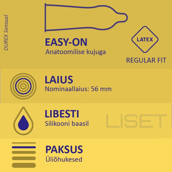 Proovi kondoome, mis on õhukesed, et saavutada maksimaalne tundlikkus ning mis on vastupidavad usaldusväärse kaitse tagamiseks. Koge uusi aistinguid ja vii intiimsus järgmisele tasemele! Maksimaalselt õhukesed, et säilitada loomulik tunne. Sile struktuur tagab kasutamise ajal mugavuse ja pehmuse. Anatoomiline “Easy-On” kuju muudab selle lihtsasti kasutatavaks ja tagab mugava istuvuse. Silikoonist libesti vähendab hõõrdumist ja kõrvaldab ebamugavustunde. Durex Sensual on üliõhukesed kondoomid, mis tagavad maksimaalse mugavuse ja loomulikud aistingud. Neid pole nahal peaaegu tundagi ning mugav anatoomiline kuju teeb peale paneku lihtsamaks ja suurendab kasutamise mugavust. Durex Sensual on valmistatud naturaalsest lateksist, kuid sellel puudub tugev lõhn ja pehme tekstuur sobib ideaalselt tundlikule nahale.