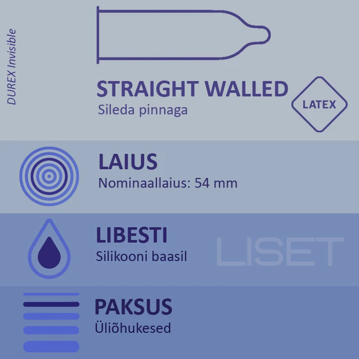 Eriti õhukesed kondoomid DUREX Invisible tagavad sulle maksimaalse tundlikkuse, säilitades samal ajal kõrge turvalisuse ja kaitse taseme. - Ekstra õhukesed ja eriti tundlikud - Sileda pinnaga - Läbipaistvad, libestatud ning valmistatud looduslikust lateksist 100% elektrooniliselt testitud 6 kondoomi