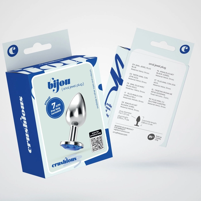 CRUSHIOUS Bijou - see on luksuslik ja elegantne anaaltapp, mis on loodud neile, kes hindavad esteetikat, mugavust ja eksperimenteerimist. Kaunis disain ja sinine kristall muudavad selle tõeliseks ehteks sinu kehale. Sile metallpind tagab uskumatult sujuva libisemise ja muudab tapi ideaalseks temperatuurimängudeks - lihtsalt kasta see sooja või jahedasse vette, et lisada uusi aistinguid. Kuju sobib ideaalselt täiendavaks stimuleerimiseks vaginaalseksi ajal ja sobib nii algajatele kui ka kogenumatele kasutajatele. Kasuta veepõhise libestiga või maksimaalse mugavuse saavutamiseks spetsiaalse anaalse libestiga. Pärast kasutamist piisab pesemisest sooja vee all pehme seebi või spetsiaalse mänguasjade hooldusvahendiga. Sisestamise sügavus: 6 cm. Läbimõõt: 2,7 cm.