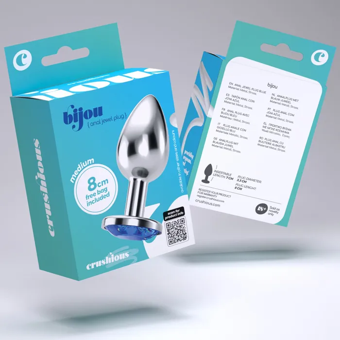 CRUSHIOUS Bijou - see on luksuslik ja elegantne anaaltapp, mis on loodud neile, kes hindavad esteetikat, mugavust ja eksperimenteerimist. Kaunis disain ja sinine kristall muudavad selle tõeliseks ehteks sinu kehale. Sile metallpind tagab uskumatult sujuva libisemise ja muudab tapi ideaalseks temperatuurimängudeks - lihtsalt kasta see sooja või jahedasse vette, et lisada uusi aistinguid. Kuju sobib ideaalselt täiendavaks stimuleerimiseks vaginaalseksi ajal ja sobib nii algajatele kui ka kogenumatele kasutajatele. Kasuta veepõhise libestiga või maksimaalse mugavuse saavutamiseks spetsiaalse anaalse libestiga. Pärast kasutamist piisab pesemisest sooja vee all pehme seebi või spetsiaalse mänguasjade hooldusvahendiga. Sisestamise sügavus: 7 cm. Läbimõõt: 3,3 cm.