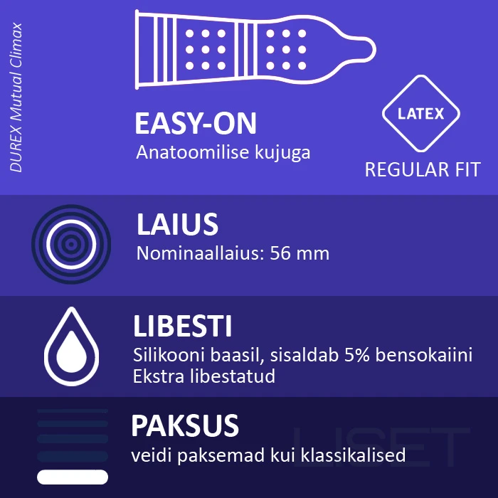 Kondoomid DUREX Mutual Pleasure (või Mutual Climax). Ribid ja täpid on loodud selleks, et naise tundlikkust suurendada, ning koos Performa libestusainega, et mehel hoogu maha võtta. Loodud ühiseks kulminatsiooniks. Performa™ libestusaine sisaldab 5% bensokaiini, mis on paikne tuimesti, et aidata mehel kauem kesta. Ribide ja täppidega kondoom, et aidata naisel suuremat orgasmi saada. Dermatoloogiliselt testitud. Läbipaistev looduslik lateks 100% elektrooniliselt testitud 10 tk.