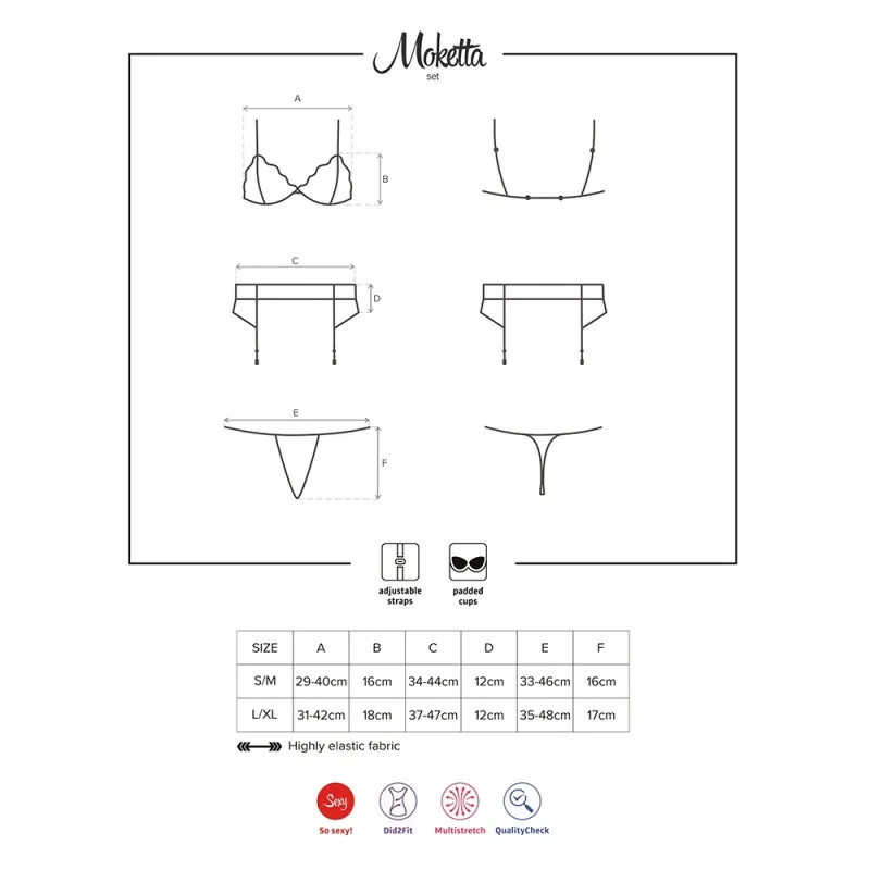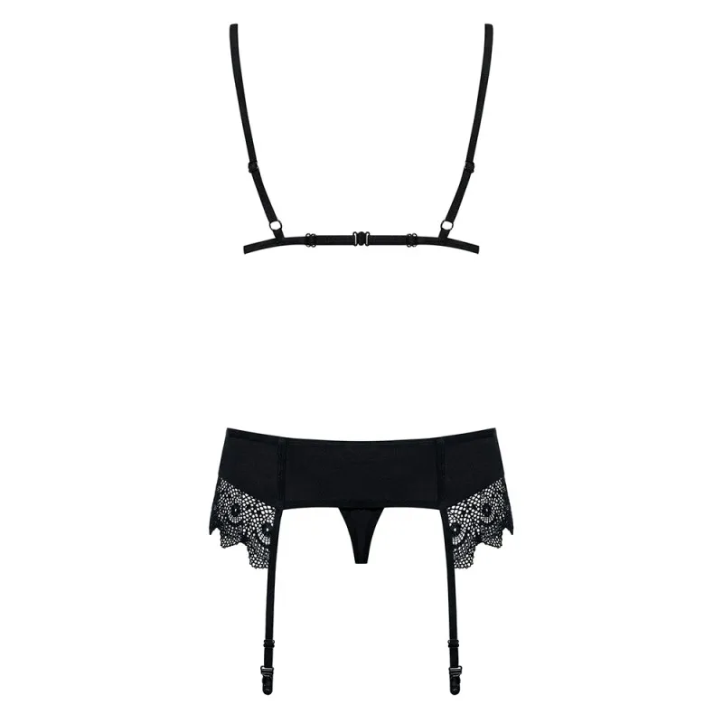Tunne end mugavalt ja vastupandamatult selles komplektis, kuhu kuuluvad tugikaartega rinnahoidja, stringid ja sukahoidja. Riietu sensuaalselt ja omapäraselt ning aja ta kirest hulluks. See on OBSESSIVE'i toode - tegemist on juhtiva brändiga, mida iseloomustab erootilisus ja sensuaalsus ning mille unikaalsed mudelid tõstavad naise keha veelgi enam esile. Sisaldab: rinnahoidja, stringid ja sukahoidja. Värv: must Materjal: 85% polüamiid, 15% elastaan.